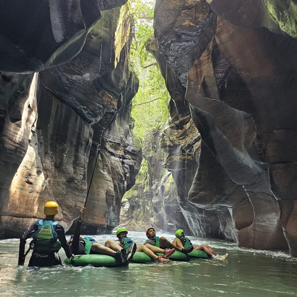 La travesía por el Cañón del Guape en Tubing en Uribe Meta mezcla misterio y majestuosidad natural, con cuevas habitadas por guácharos que llenan el recorrido de sonidos fascinantes.
